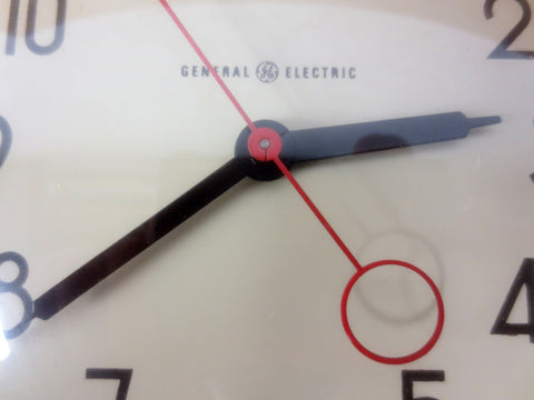 Excellent condition, very clean, fully functional electric wall clock signed General Electric. Plugs into a standard outlet, easy to hook on a wall. Complete, no cracks, white plastic case and glass window. Stamped "General Electric Clock Model 2QH2" on back. Measures 7 X 7 X 2 1/4.