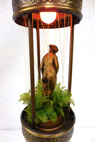 Fully functional, complete and all original, very clean. Vintage mineral oil rain drop ceiling light, 21" tall, 18" top without top hook, 6" diameter. Can be hanged to a standard or very high ceiling, or stands on its own on a table. Has its original tags signed Johnson Industries. Beautiful metal sculpture of a woman bathing, surrounded by tall plastic ferns. All metal, on/off switch, very long and safe power cord and matching chain that covers it, light bulb included. Oil will be removed for safe shipping. Total weight 2.6 kg.