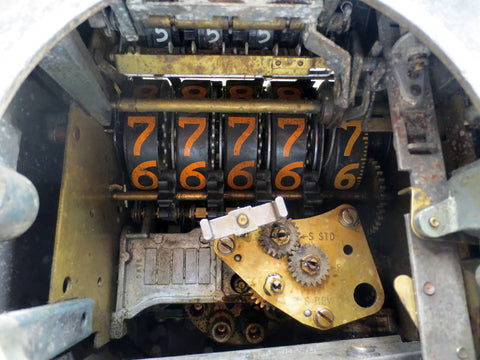 All numbers reset correctly and buttons work. Both dials are clear and intact. Metal case is in good condition, surface rust only. Original color preserved.The handle is complete and turns well on the right. No handle on the left side. The metal tag is in great condition and says "Neptune Print-O-Meter Auto Stop Register Model 434 Code 1" with instructions. Beautiful piece to restore and add to a gas pump. Can also be transformed into a cool lamp. Measures 8 X 9 X 8 inches