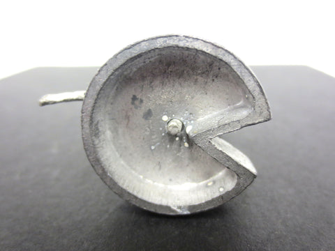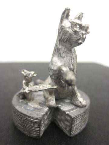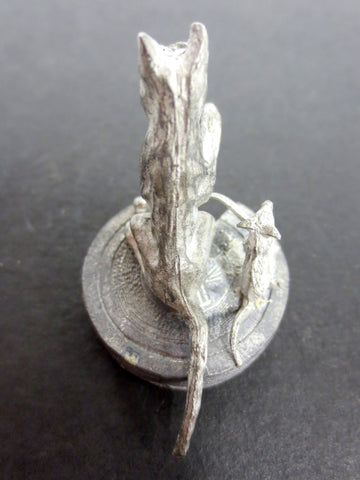 Very detailed, perfect condition. Measures 1 1/4" high, cheese base diameter is 1". Heavy, made out of pewter. The cat rotates 20° and wears glasses. The mouse is holding a knife and the cheese is open and shows texture. Very nice piece, found in a lot with several British lead toys.