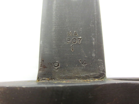Mint condition blade and scabbard. Blade is identified "MA 1907 1 9 '4" on one side and "X OA" with a top arrow on the other. Blade is 17" long (total 21 3/4") and is Australian made for British military, model 1907 No. 1. OA means Orange Arsenal. SLAZ 44 is also engraved on the wood handle. The leather and metal scabbard is marked Mangrovite (Arsenal Manufacturer) with a B and a top arrow.