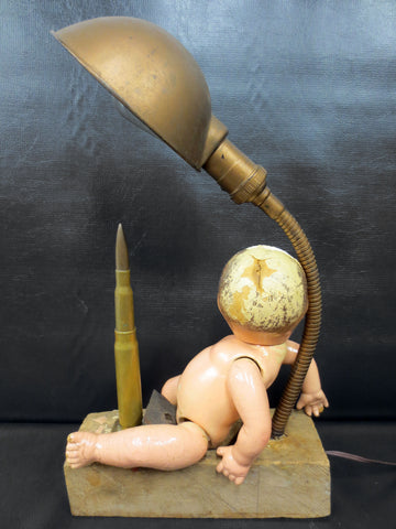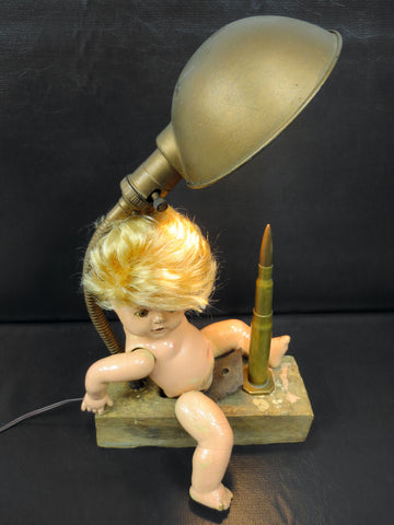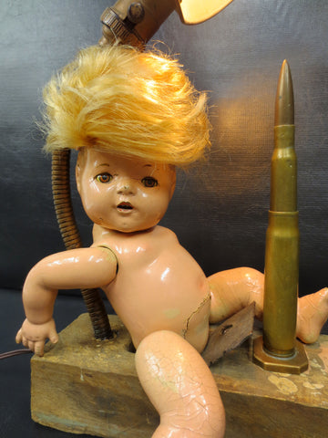One of a kind, hand made, ready to plug in. Measures 17 inches tall and 10 inches wide. Steampunk and Folk Art desk lamp made with antique artifacts. Baby Donald is an antique composition doll with eyes that open and close and very realistic teeth. Base is a primitive carpenter's wood plane and the gooseneck lamp neck is Art Deco. The "Korean" rocket is a genuine WWII brass shell. The vintage hair is removable as desired and you can move baby Donald's arms. Edison style light bulb included. To help you shed light on "fake news"!