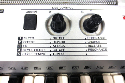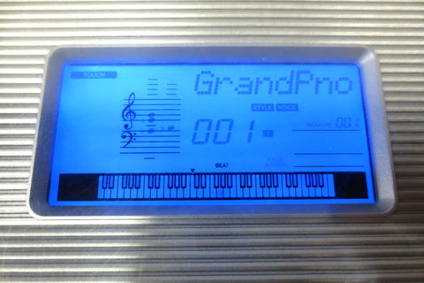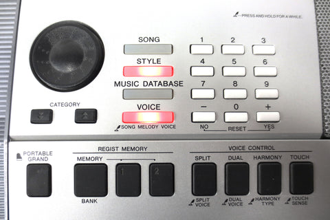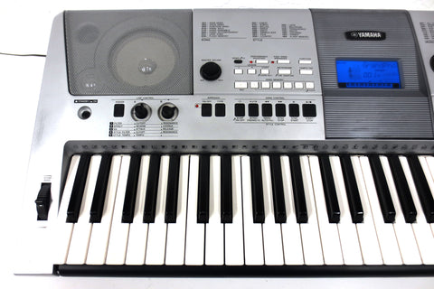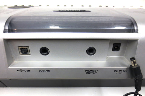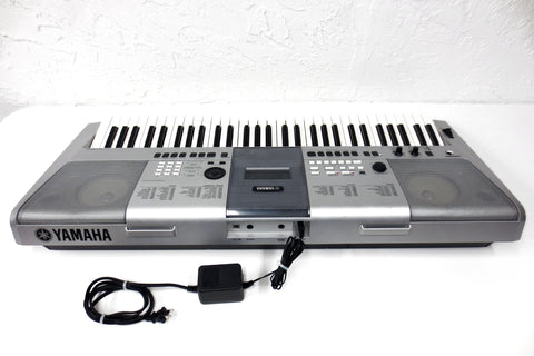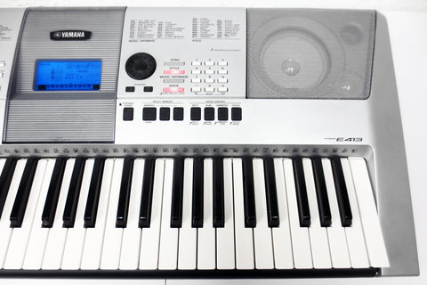 Fully functional, very clean, includes its instructions manual and power supply, light scratches only. Portable digital keyboard model PSR-E413 by Yamaha. Keyboard has powerful built-in speakers, runs with its AC power or batteries, 61-note touch sensitive keyboard, large selection of GM sounds (116 panel voices, 12 drum/SFX kits, 361 XGlite voices plus 20 arpeggio voices), built-in reverb and chorus effects, auto styles and preset songs, USB connectivity for downloading songs into the internal Flash ROM, 6-track sequencer for writing your own songs, has a sampled stereo grand piano, real-time pitch wheel control and more. A music sheet holder, sustain pedal and tripod can easily be added if needed (not included). Also has a standard headphone jack.