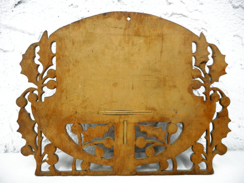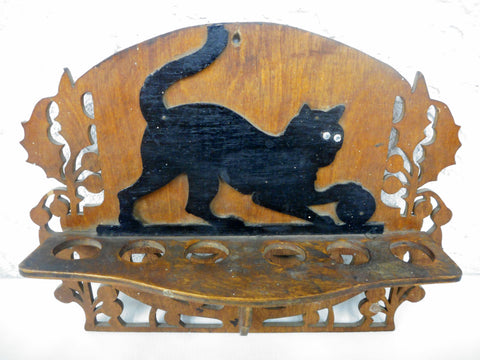 Excellent condition, sturdy, ready to hang your tobacco pipes, keys or telephone. Wood in excellent condition, patina preserved. Measures 9 X 7 inches. Holds up to 6 tobacco pipes. Beautifully hand carved scene of a black cat playing with a ball in a background of Holly leaves and fruits. Tobacco pipes not included.