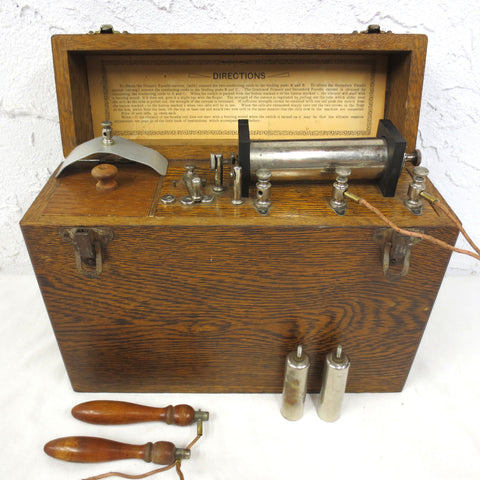 Perfect condition, complete with instructions and accessories, no batteries. Nickel plated controls, main electrode in mint condition. Beautiful solid oak box, one drawer for accessories, the other for cells. Clear instructions on the inside of the box's lid. Box measures 12 X 9.75 X 4 inches.