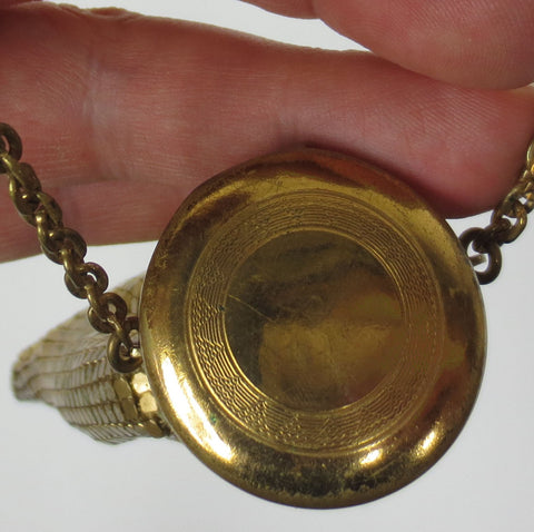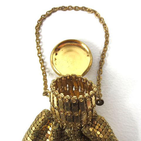 Authentic Art Deco gold toned mesh purse. Excellent condition, no missing link or mesh, opens and closes well. Chain handle, inside is lined with satin. Measures 4 1/4 X 6 inches and weighs 106 grams.