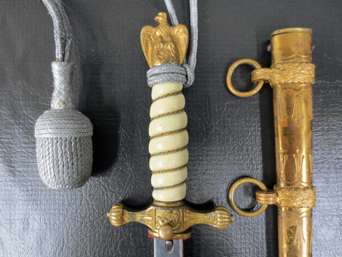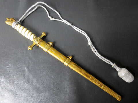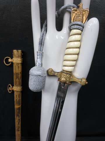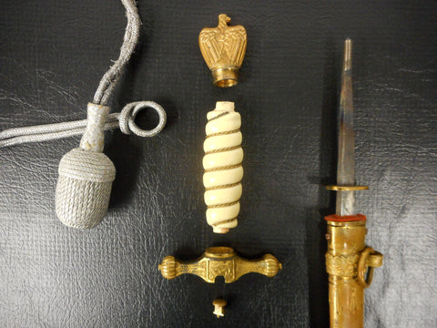 Excellent condition, original brass sheath and decorations. 9 3/4 inches long double sided blade in mint condition, no edge, never sharpened. Total length is 16.5 inches. Dagger was used during WWII German navy military ceremonies. Sheath is covered with hand engraved leafs and crowns and has two uniform fixation rings. Sheath and blade have a sophisticated locking mechanism. Handle guard is very ornate and has a boat anchor on both sides. Handle is white resin with a gold metal spiral. The dagger's butt has a sculpted eagle sitting on the German army emblem.