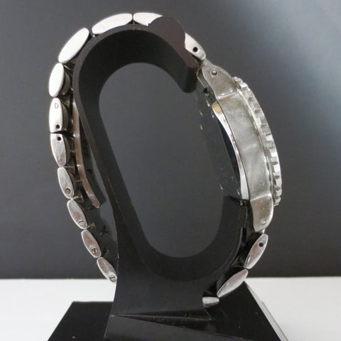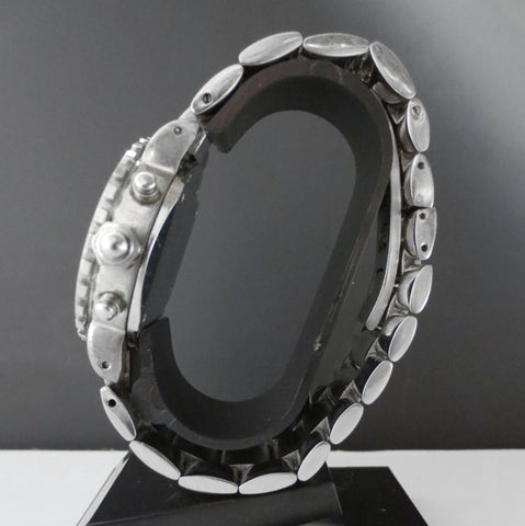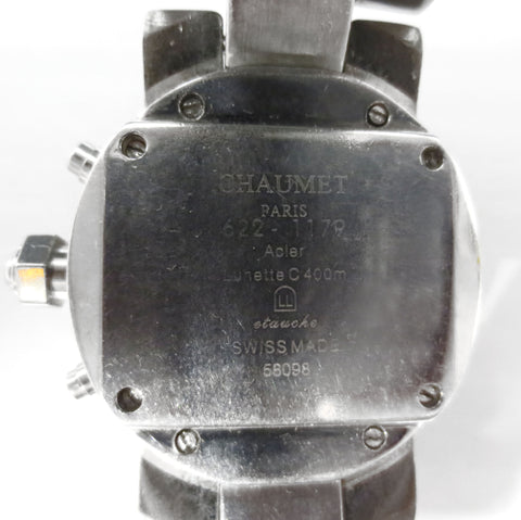 Excellent working condition, perfect crystal and dial, very clean. Heavy diver case, 36mm diameter. Original factory stainless steel bracelet, 400 meters water resistant. This luxury quartz watch has a white dial, a 3 dials chronograph and arabic numerals. Arms glow in the dark. The crown is protected by a diving cap. Case on back is marked in French. Translation is "Chaumet Paris 622-1179, Steel, Crystal, C400M, Waterproof, Swiss Made 58098". No box. Very well maintained. Worth around 2500 USD retail new.