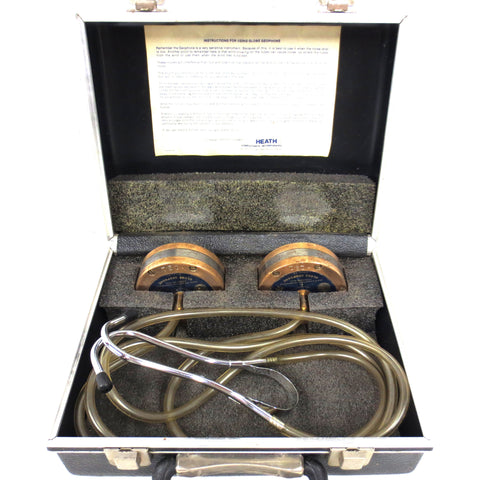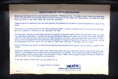 Fully functional, complete with its original carrying case, stethoscope and instructions. Water leak detector by Heath, model Globe Geophone. Case and unit are very clean and ready to use. Tubing is long, souple, no cracks. Stethoscope is like new. Both circular ends are heavy solid brass and each one has its original tag. Case measures 11 X 9 X 4 1/2 and weighs 8.5 pounds.