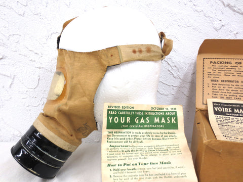 Original instructions, box and mask dated October 15th, 1942. Box and instructions in excellent condition. Mask is complete, shows age but is still sturdy. This civilian respirator was given to the general population for protection in case of gas attack, by the Dominion Government of Canada. Instructions are both in English and French. Found in Montreal, Quebec, Canada.