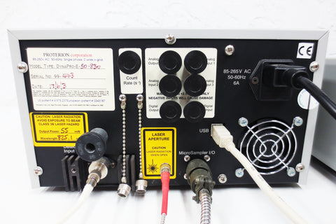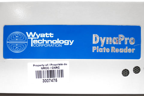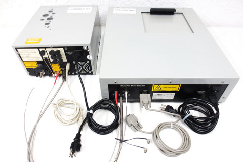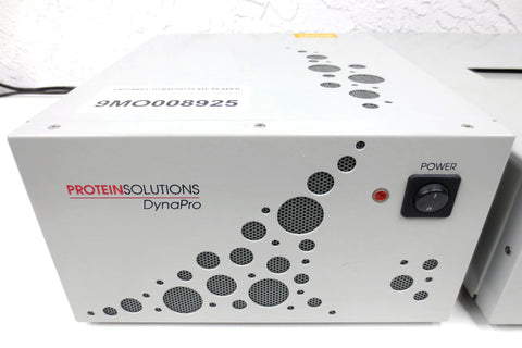 Like new condition, working, matching unit set, cables included. Surplus from Canada's National Research Council (NRC). Includes Wyatt Technologies DynaPro lab well plate reader model DP-PR-03 and model E-50-830 marked Protein Solutions. All necessary cables included, fits well plates up to 3 3/8 X 5 in, large loading door. Both units power up and work, calibration and servicing recommended before use. This is a class 1 laser product, for professional use in a laboratory only. No scratches, no dents, no broken parts. Total weight 40 pounds, approx. shipping box size 23 X 18 X 16 in.