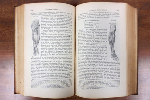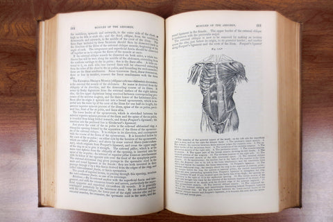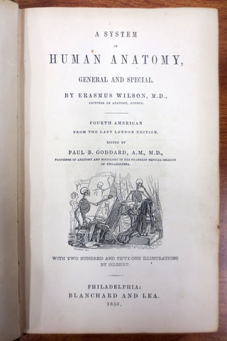 Rare antique 1856 human anatomy and dissection book by Erasmus Wilson, M.D. Excellent condition, binding and cover are very sturdy, no missing parts, no loose page. 251 beautiful illustrations by Gilbert. Book is in English and entitled "A System of Human Anatomy, General and Special". Published by Blanchard and Lea in Philadelphia in 1856. Dedicated to Sir Benjamin Collins Brodie, Sergeant-Surgeon to the Queen. Hand written signature on the first blank page. Book measures 9.25 X 6 inches and has over 576 pages.