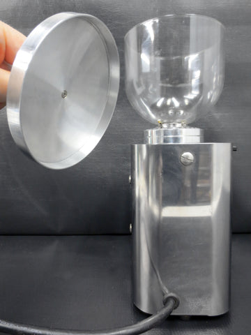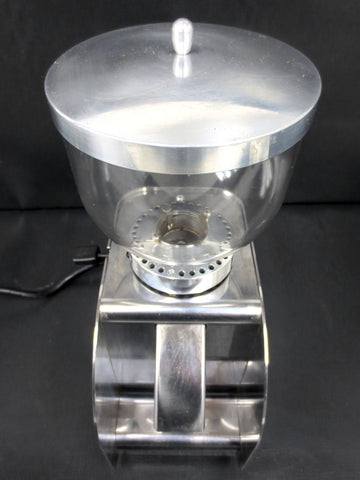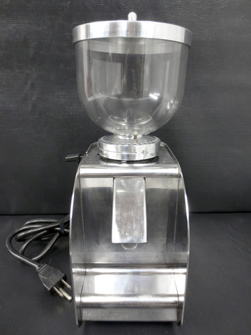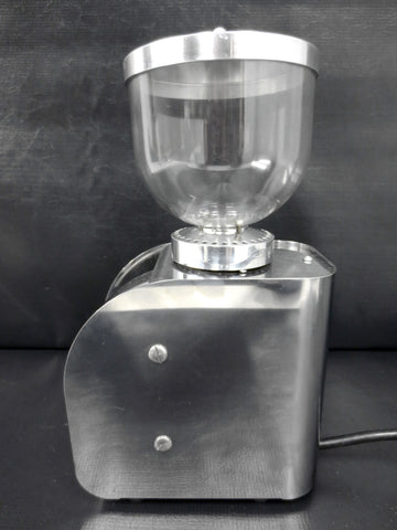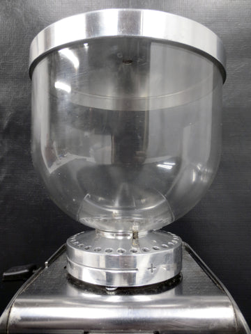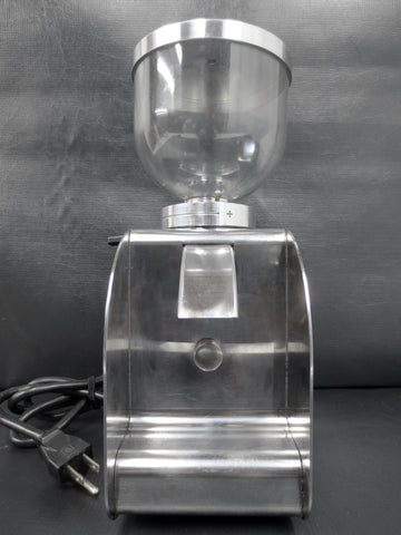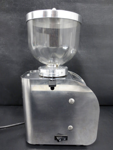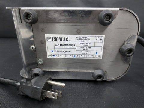 Excellent condition, professionally cleaned and ready to use. Commercial Italian coffee grinder with a filter holder, conical burr and grinding types' selector. Bean hopper capacity is 300 grams. All stainless steel with a thick plastic globe. Signed "Isomac Grandmacinino 115 V, Macherio (MI) Italy". Measures 12 1/4 X 4 1/4 X 7 inches.
