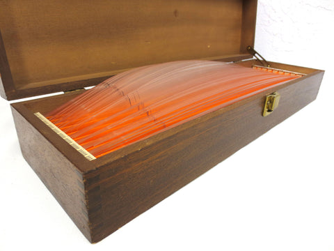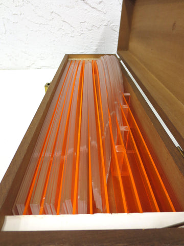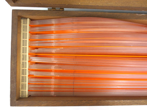 Excellent condition, complete set of 55 French ship curves ranging 100 to 5000 mm, used for designing, drawing and drafting boats. All rules are clean, no chips, no cracks. These ship building scales are plexiglas and stored in a compartmentalized dovetail wooden box signed "OP6010574". Box measures 20 X 6 X 4 inches.