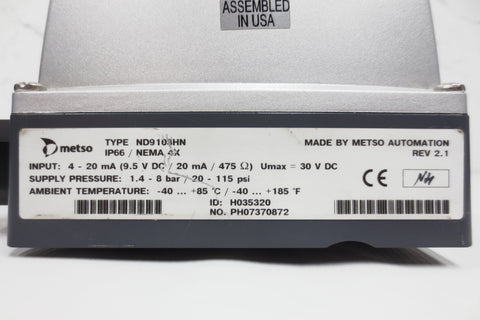 Like new condition, functional and very clean. Valve positioner/controller by Metso Neles Automation, Type ND9103HN, IP66, Nema 4X. Input: 4 - 20 mA (9.5 V DC / 20 mA / 475 Ω), Umax = 30 V DC. Supply Pressure: 1.4 - 8 bar / 20 - 115 psi. Ambient temperature: -40... +85 °C / -40 ... +185 °F. Weighs 1.86 kg and measures 5 1/2 X 6 3/4 X 4 1/2 inches.