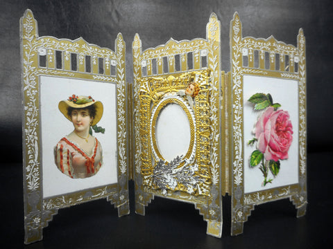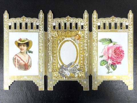Authentic Victorian wish card and picture frame from the early 1900's, mint condition, vivid colors. Rare, unused, center space to add a photo. Divided and folded in 3 panels, stands well on its own. Beautiful montage of a lady, rose flower, angel and lace. Dimensions: 6 1/4 X 10 1/4 inches (opened), or 3 1/4 inches (unopened). Center print says "Happy Moments. I will not write to you of love, We've years before us yet, But happy moments spent with you I shall not soon forget".