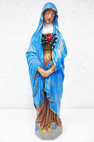 Acquired from a closed monastery in Montreal, Quebec, Canada. 23.5 inches tall plaster sculpture of Our Lady of Sorrows, Virgin Mary crying with her heart pieced with seven swords. Perfect condition, original paint with gold flakes, no chips, no cracks. Weighs 4.72 kg and measures 7 X 23.5 X 5.5 inches.