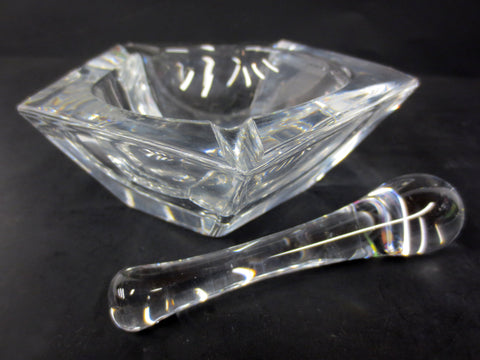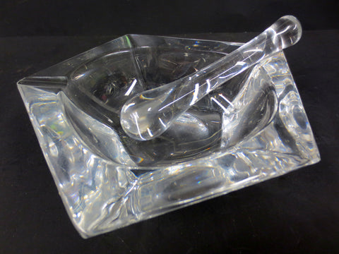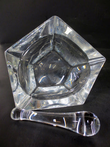 Rare model, excellent condition, very clean. Signed "Daum France". Made of white crystal. Mortar is heavy, has a pentagon shape and measures 6 1/4 inches wide, 2" high. Pestle measures 4 1/2 inches long, no chips, a bit of friction wear on one side due to use. Great design, odd shape.