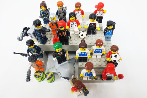 All 20 minifigures in mint condition, signed Lego, no missing body parts. 17 accessories included. On the left, 9 action minifigures including a 4.5" long grey shark with white teeth and an opening mouth #62605, a Joker with a gold gun, Avengers and Agents. On the right, 11 Adidas soccer team players with 2 original balls. Grey platform on photo not included.