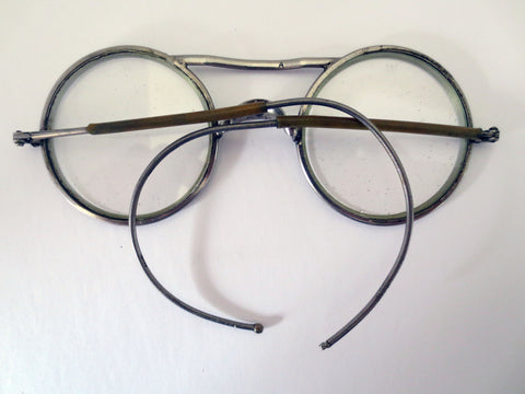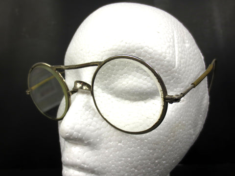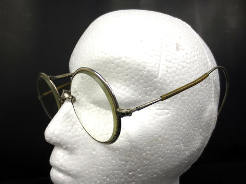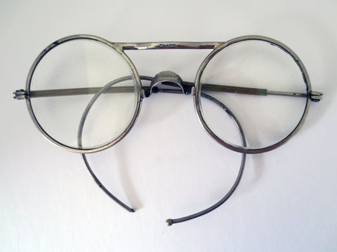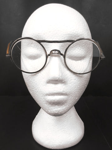 Sturdy, clean, beveled glass in excellent condition. No prescription, standard protective glasses. 5.5 inches wide, each glass has a 2 inches diameter. Glasses and frame are marked Willson with an "A" on back. They hold well, open and close well. Chrome in excellent condition. Missing a temple tip ball.