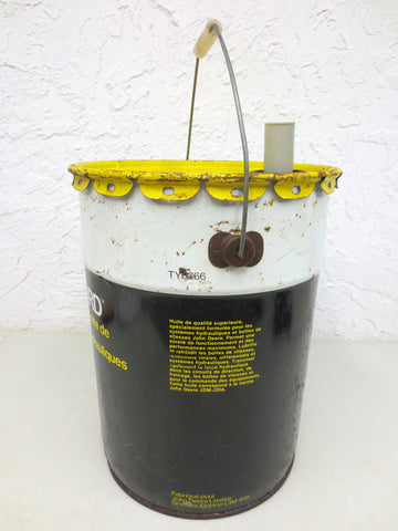This is a 1970's 20 litres John Deere transmission and hydraulic oil can. Excellent condition inside and out, very clean. Complete with retractable poorer and handle. Marked "John Deere Hy-Gard Transmission & Hydraulic Oil 20 litres (4.4 Gallons) TY6266" both in English and French. It has a 12" diameter and is 17" high. Bottom has no hole, very sturdy. Can shows surface rust only. Colors are still vivid.