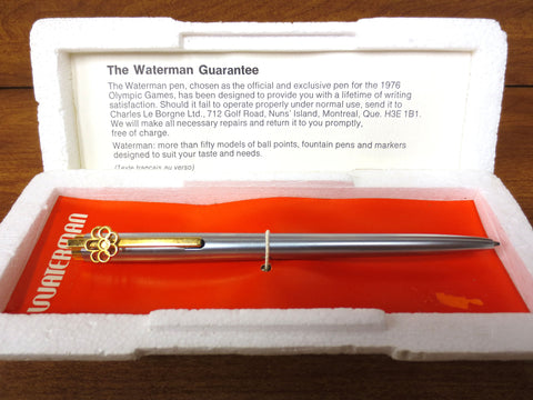 Pen in mint condition, slick modernist design, original Guarantee and foam box. Measures 5 1/4 inches long, clip has a 3 dimensions 1976 Montreal Olympics emblem on it. Mat silver barrel and gold tone clip. Fully functional, rare model. Guarantee explains Waterman was the official and exclusive pen for the 1976 Olympic Games.
