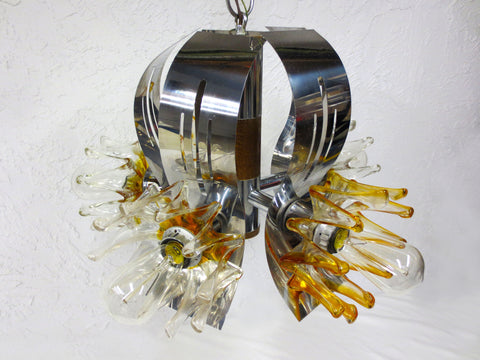 Vintage Mid Century Brutalist Chrome Ceiling Light Chandelier 26", Wood, Glass Flowers