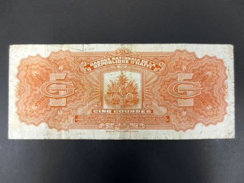 Five (Cinq) Gourdes Haïti banknote, very fine (VF) condition. Number DF879951. The Battle of Port-au-Prince happened on October 6th, 1919, during the Second Caco War.