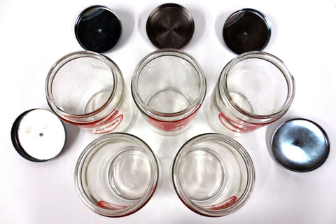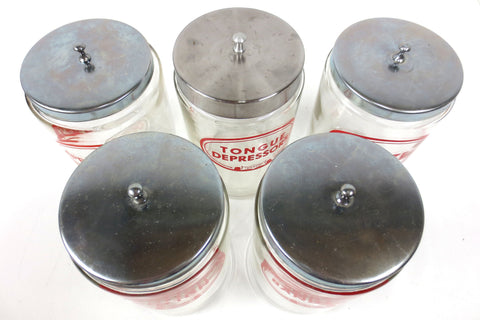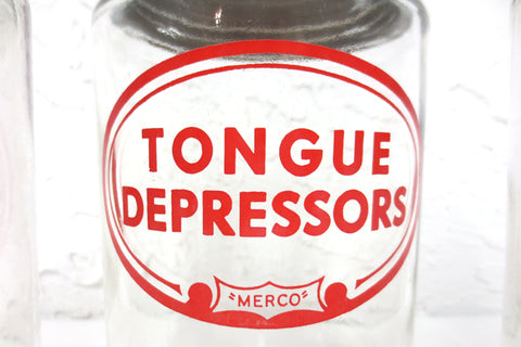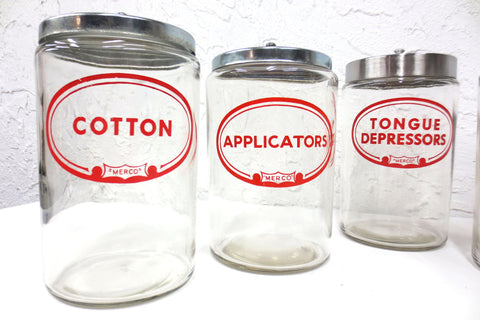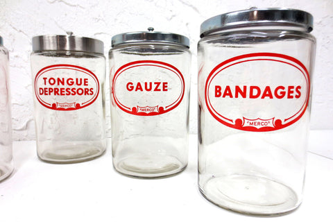 Authentic medical glass jars signed Merco, matching designs. Each jar has a 4 1/2" diameter and is 7" tall. Glass is very clean, no chips. Beautiful red graphics marked Bandages, Gauze, Applicator, Cotton and Tongue Depressor. This last jar is slighly bigger then the others, with a thicker lid, same design and brand.