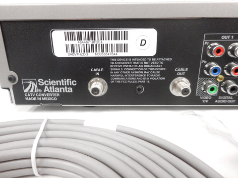Never used, no box, activation ready. This TV cable recorder has a 320 GB working hard drive and an HDMI output. Includes its original remote and instructions, HDMI cable, original power cord, video component and audio composite cables. Has all its original manufacturer's tags and serials. Manufactured by Scientific Atlanta.