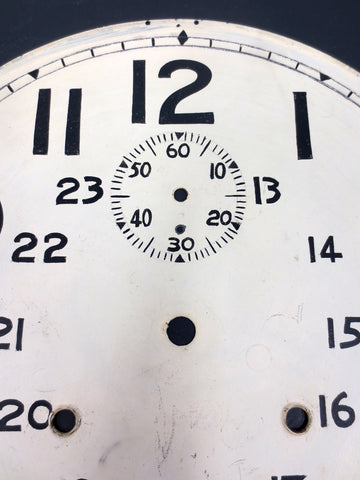 Excellent condition, rare 24hrs hand painted dial on a thick metal back. Large 1-24 numbers and a unique internal seconds dial. Use it as a cool wall clock with a basic clock motor and hands or to restore banjo wall clocks. We found only 3 of these dials.