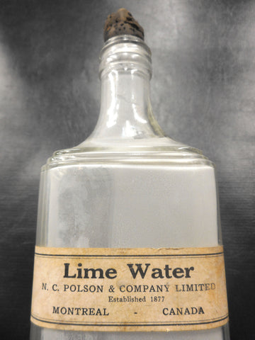 Bottle in excellent condition, no chips, no cracks. Original tag marked "Lime Water N.C. Polson & Company Limited Established 1877, Montreal, Canada". Red sticker on back marked "Contents 16 fluid ounces". Bottom of bottle is embossed 16 OZ. Bottle is empty, preserved traces of the medicine inside to keep it authentic.