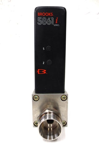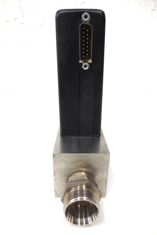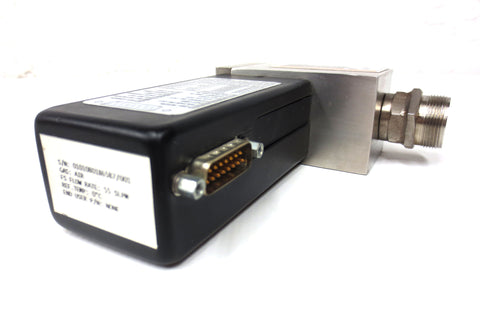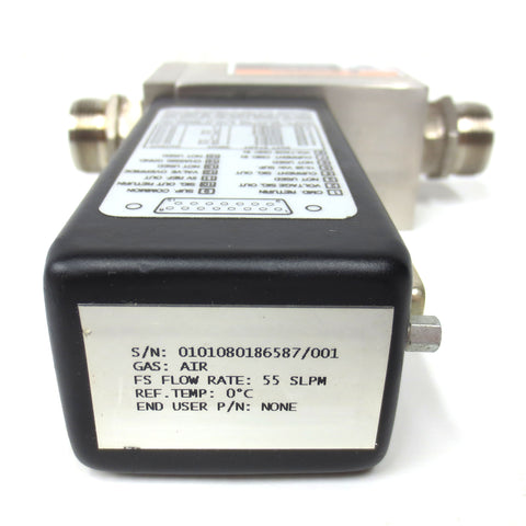 Fully functional, original tags, very clean. Mass flow sensor for air by Books Instrument, model 5861 i Series. Includes two stainless steel fittings. Flow rate: 55 SLPM. Gas: Air. Ref. temp 0°C. I/O signal: 0-5 Vdc. Power: 24 Vdc. P1/P2: 5/0 psig. 1500 psig max. Base is model 586li. Pre-owned and tested industrial surplus from a closing plant in Quebec, Canada. Minor surface scratches only.