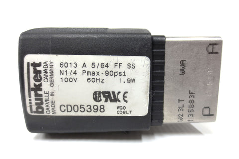 Burkert Solenoid Valve 100V 1.9W 60Hz 1/4" NPT PMAX 90PSI Model 6013 A 5/64 FF SS