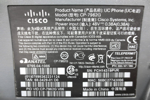 Refurbished and very clean, 12 pages manual included (pdf). Cisco IP phone model 7962 CP-7962G with its original adjustable footstand and handset. Large 4 X 3 inches LCD screen, quick footstand adjustment button, can also be screwed to a wall. Features: Programmable buttons, shows call features on screen, messages, directories, services, help, settings, volume headset, mute and speaker buttons. Supports a variety of power supplies 48V, 0.38A (not included). All units available are in the same condition (see our photos): Fully functional, professionally cleaned, very light scratches only, no broken parts. Phone weighs 1.19 kg and measures 11 X 8 1/2 X 4 inches when footstand is closed.