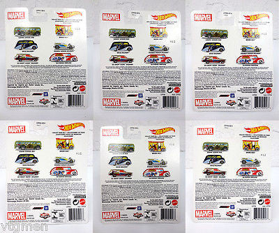 All boxes are new, unopened and in mint condition. Contains Hotwheels cars: Captain America 1938 Dodge Airflow, Spiderman 1964 Chevy Nova Delivery, Groot Surfin' School Bus, Wolverine Double Demon Delivery, Starlord Deco Delivery and Antman Breadbox. Set will be shipped in a sturdy and waterproof box.