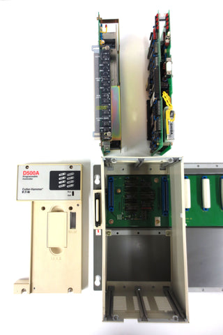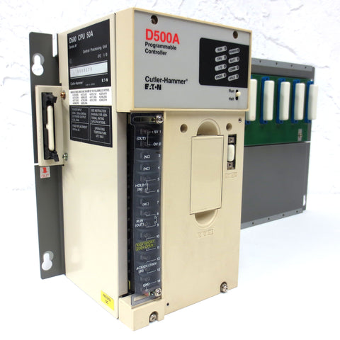 Tested and working, like new, original manufacturer's tags. Programmable controller model D500A CPU 50A Series A1 by Cutler-Hammer Eaton with a Cutler-Hammer D500-RAC8 expansion l/O rack. Specifications: Power input 50VA: 120 or 240 Vac, DC Power output 4.5A / 5Vdc, serial 5500128. All connectors are protected with a rubber cover. The D500 family of PLCs consists of several l/O cards and the racks used to mount them. The D500 is a full function programmable logic controller offering all of the capabilities of larger frame PLCs in a compact design. Surplus industrial electronics from a plant in Montreal (Quebec, Canada). Unit measures 19 X 7 X 5 1/2 inches and weighs 7 pounds.