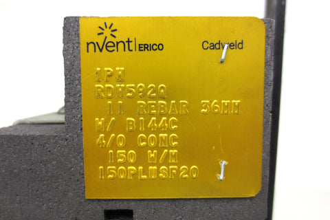 Unused mold, very clean, includes Cadweld clamp with 23" long handle. Mold is marked IPH RDH592Q, 11 REBAR 36MM  W/ B144C 4/0 CONC, 150 W/M, 150PLUSF20.