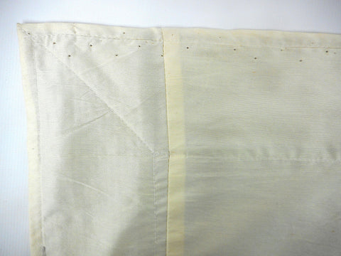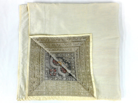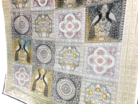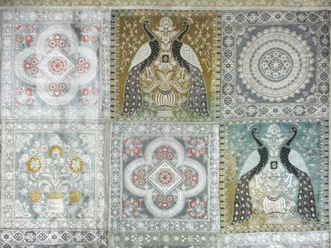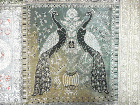 Excellent condition, high quality silk, handmade. Beautiful embroidered peacocks and flowers. Gold, pink, green and black threads. Patchwork of 4 different patterns. From Southeast Asia, possibly India. Light surface nail marks on back due to hanging. Measures 47 X 47 inches.