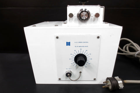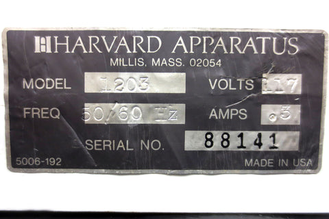 Excellent working condition, very clean. Complete, all original and portable (24 pounds). Laboratory and hospital peristaltic pump by Harvard Apparatus, model 1203. High quality metal construction, long grounded power cord, infusion/withdrawal switch, rate selector and speed control. Specifications: 50/60 Hz, 117 V, .3 A, serial 88141. Made in Massachusetts. Measures 8 3/4 X 10 X 10 3/4 inches.