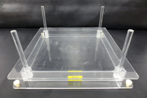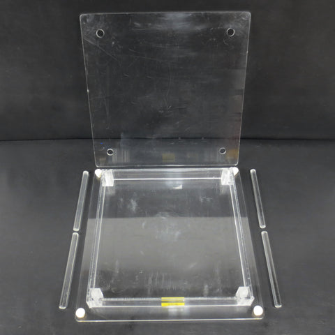 Large electrophoresis gel casting tray by Altec Labs. Includes tray base, cover, 4 fixation bolts and 4 holding cylinders. Inside chamber measures 12 X 12 X 1 1/2 in, total unit size 14 1/2 X 14 1/2 X 2 inches. Weighs 4 pounds. Very clean, no leaks, no cracks. Laboratory surplus from the National Research Council of Canada.
