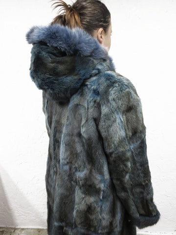1750 USD estimated retail value. Perfect condition, genuine blue fox fur coat. Signed Luigi di Firenze New York Paris. Professionally cleaned, like new, ready to wear. Large and comfortable head cap, deep hidden pockets on each side. Measures 46 inches long, 61 in long with cap. 20 inches shoulder to shoulder. Sleeves are 25 in long.
