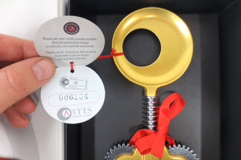 New with tags, in its original box, still attached. Luxury aluminum corkscrew signed and designed by Giuseppe Todeschini, Artis Technology & Design. Platinum Gold Il Cavatappi model, measures 13 X 4 3/4 inches. Todeschini created world renowned parts for racing bicycles, motorcycles, Ferrari and Alfa romeo cars. Some of his work is permanently displayed at the Museum of Modern Art of New York (Moma).