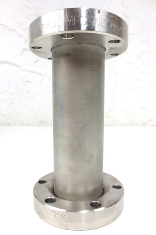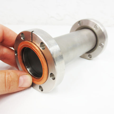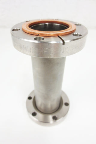 Excellent condition, very clean, ready to install. Complete with 2 copper gaskets and 12 bolts. High vacuum conflat flange to flange 2.75 X 2.75 in diameter adapter pipe by MDC Hayward. Pipe measures 5 inches long and includes 1 copper gasket. Each flange fits 6 bolts (included) Thick high quality stainless steel. Surplus from a cryogenic laboratory. Total weight 748 grams.