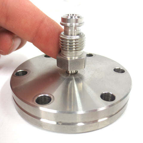 Excellent condition, very clean, ready to install. Complete with a copper gasket, 6 mounting bolts and its integrated coupler. 2.75 inches diameter vacuum conflat flange quick disconnect adapter with a 3/16 in diameter tube coupler, rotatable flange, made by MDC Hayward. 2 in tall, thick 1/2 in high quality stainless steel base. Surplus from a cryogenic laboratory. Total weight 423 grams.