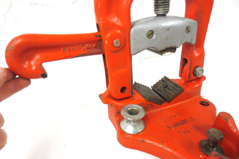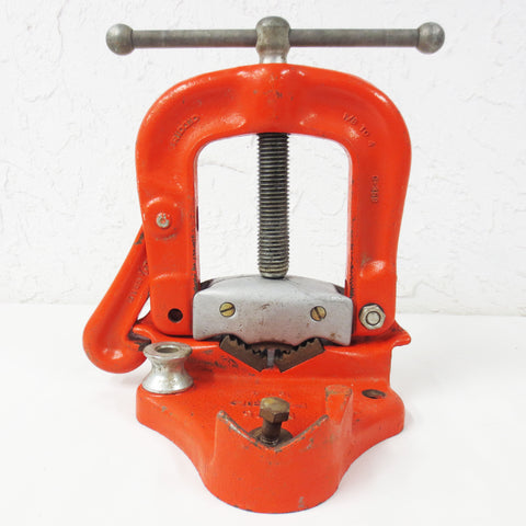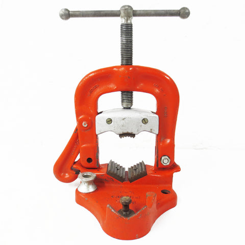 Excellent working condition, turns smoothly, original color and tag,very clean. Pipe clamp bench vise model 25 by Ridgid, supports pipe sizes 1/8" to 4 ". No cracks, no missing parts, minor paint loss only. Weighs 25 pounds and measures 11.5 X 12.5 X 7.75 inches when closed.