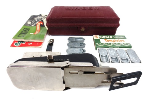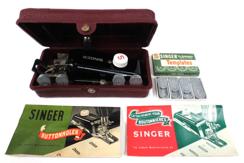 Mint condition, ready to use, complete with all its original accessories, 8 templates, case and manuals. Vintage Buttonholer attachment model 160743 from the 1950's for Singer sewing machines. Templates included: 1/2, 3/8, 5/8 (X2), 5/16, 13/16, 15/16 and 1 1/16.
