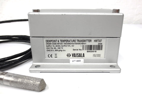 Tested, very clean, includes its original HMT337 probe with a sintered filter and user's guide (209 pages pdf). Unit is a Vaisala HMT337 Dewpoint & Temperature/Humidity transmitter, connects to external digital display. A Power-1 supply (120VAC to 24VDC) can easily be added inside (not included). High quality unit, made in Finland. Industrial surplus from a closing plant in Montreal (Quebec, Canada). Minor surface scratches only. The HMT337 probe included is for demanding processes, with an optionally warmed and vapor tight probe head.