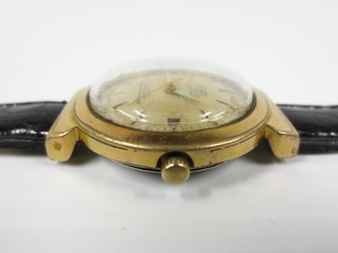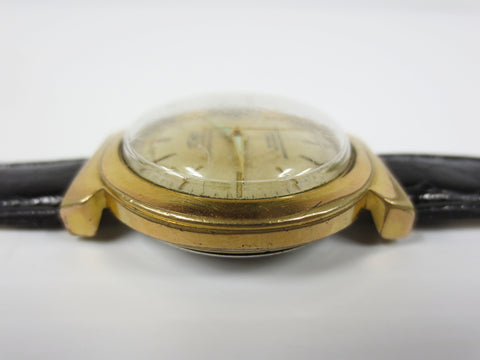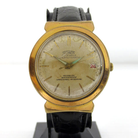 Fully functional and keeps time. This is a rare Technos Automatic watch from the 1940's. It has a thick gold filled case with a stainless steel back cover marked "Automatic 5087, Antimagnetic Swiss Made". Fancy case, large lugs. Its automatic movement has a rose gold tint and is marked "30 jewels Swiss Made T Adjusted, F692". Crystal and dial are in excellent condition. New leather band.