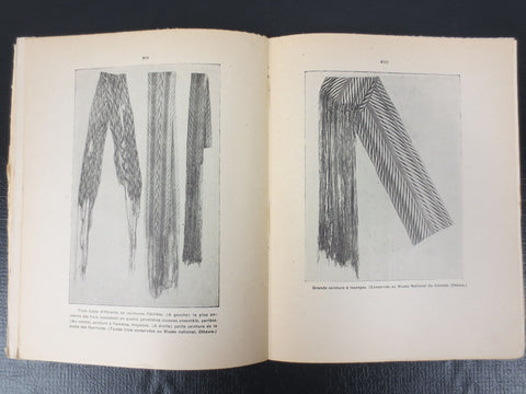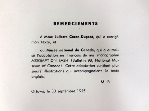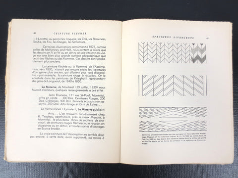 Rare illustrated book on the making and history of sash "Ceinture fléchée" in Quebec, Canada. Book is in French and dated Septembre 30, 1945. Explains the different types of sashes, motifs and regions: Assomption sash, arrow sash, pearls, flames, Hudson fur trade style, etc. Artisans throughout Quebec still weave sashes using local homespun wool. Our "Bonhomme Carnaval" still wears one proudly. Book measures 6.5 X 9.5 inches.